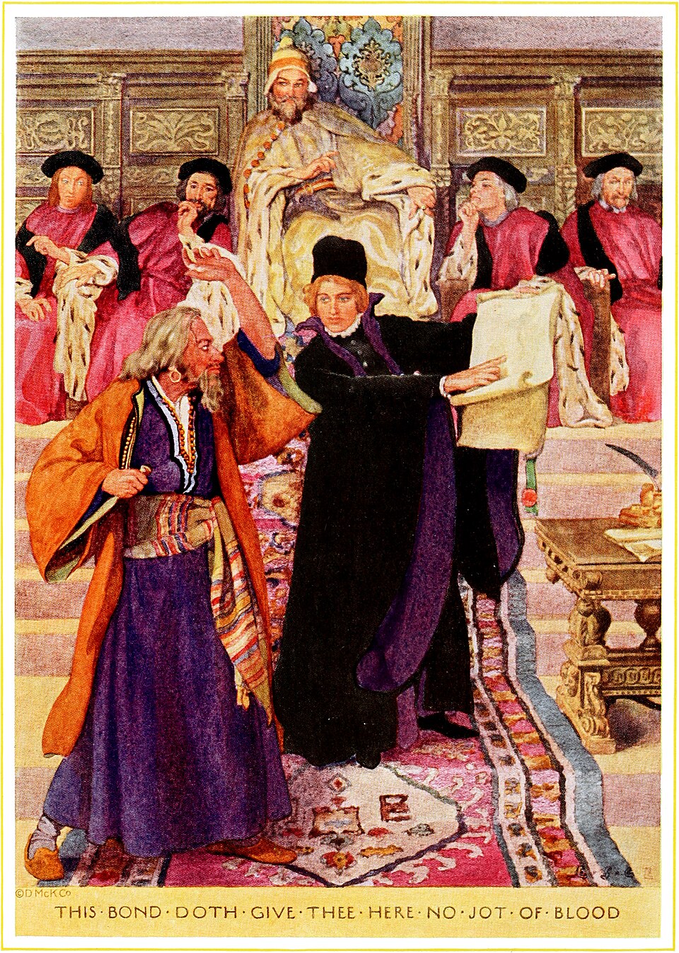Shylock.- Firmaréis un recibo prometiendo que si para el día fijado no habéis pagado, entregaréis en cambio una libra justa de vuestra carne, cortada por mí del sitio de vuestro cuerpo que mejor me pareciere…